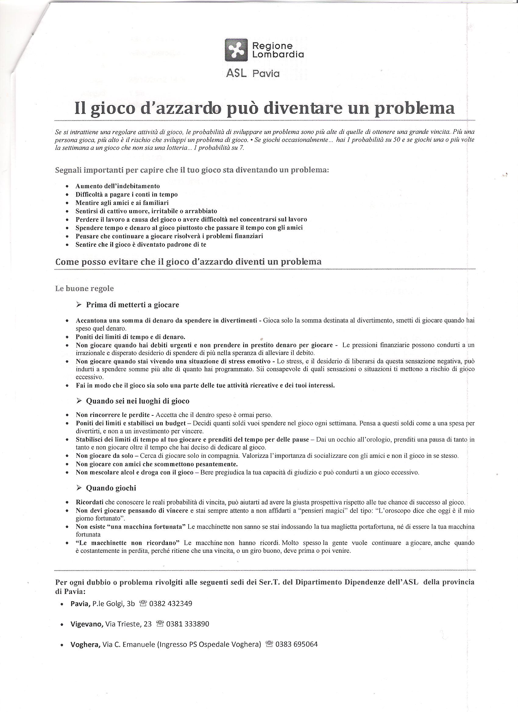 L’imminente attivazione di quanto previsto nell’art. 7, comma 5, del decreto-legge 13/09/2012, n. 158 (Decreto Balduzzi) convertito con modificazioni dalla legge 8 novembre 2012, n. 189, dal 1° gennaio 2013, IMPONE ai gestori di sale da gioco e di esercizi in cui vi sia offerta di giochi pubblici, ovvero di scommesse su eventi sportivi, anche ippici, e non sportivi, di esporre il materiale informativo predisposto dalle Aziende Sanitarie Locali, diretto ad evidenziare i rischi correlati al gioco ed a segnalare la presenza sul territorio dei servizi di assistenza pubblici e del privato sociale dedicati alla cura ed al reinserimento sociale delle persone con patologie correlate al gioco d’azzardo patologico.