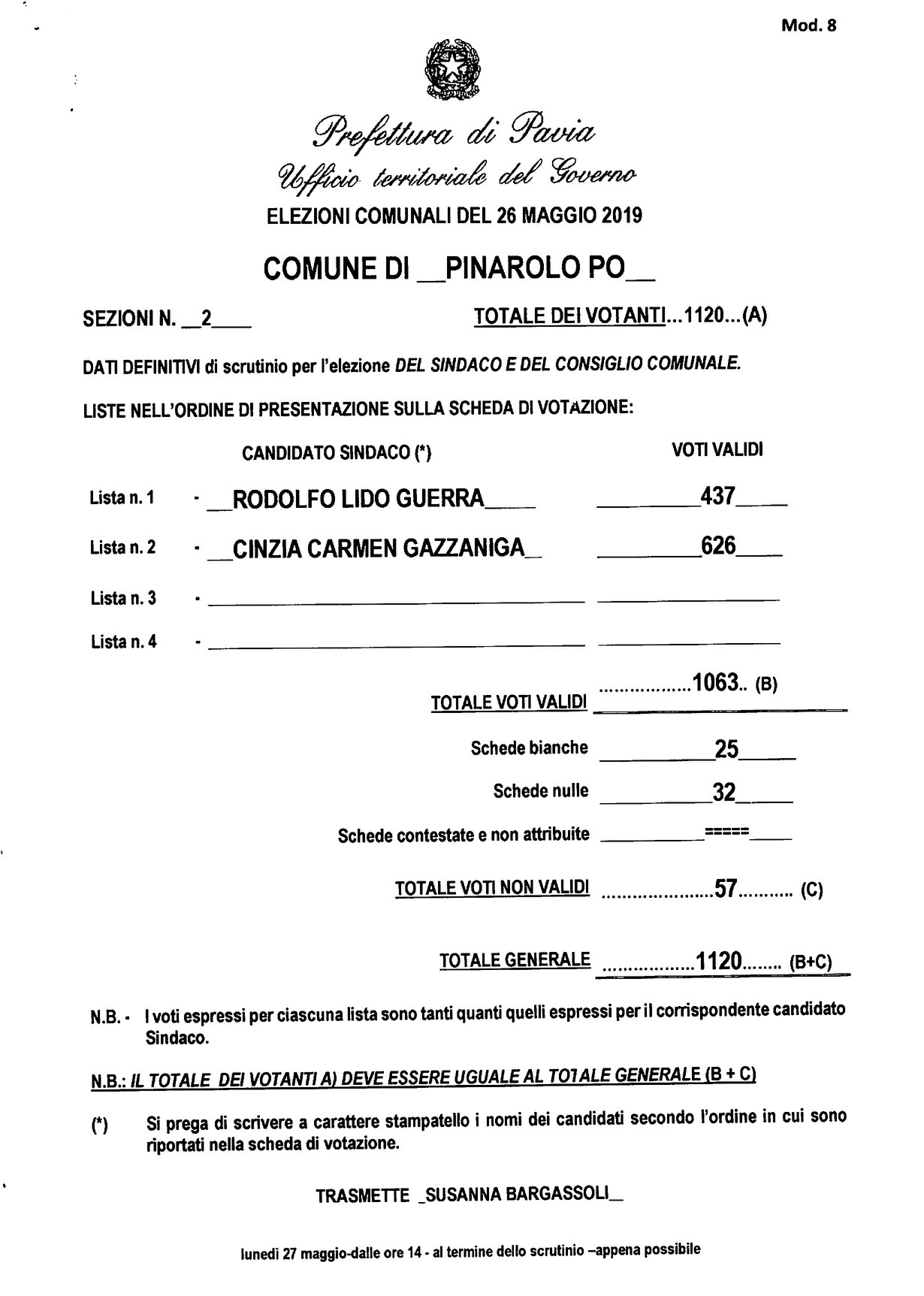 DATI DEFINITIVI VOTI SCRUTINATI NELLE SEZIONI ELETTORALI DI PINAROLO PO