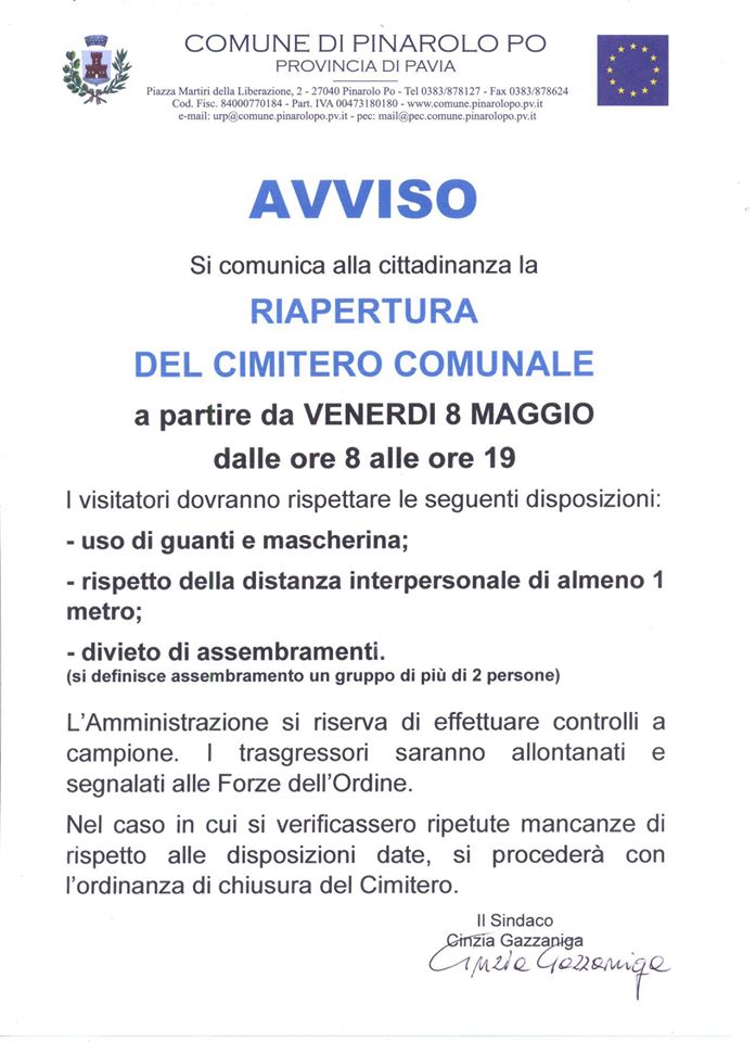 Si comunica alla cittadinanza che dal 08.05.2020 IL CIMITERO COMUNALE RIAPRIRA' AL PUBBLICO; le disposizioni da rispettare nel volantino allegato