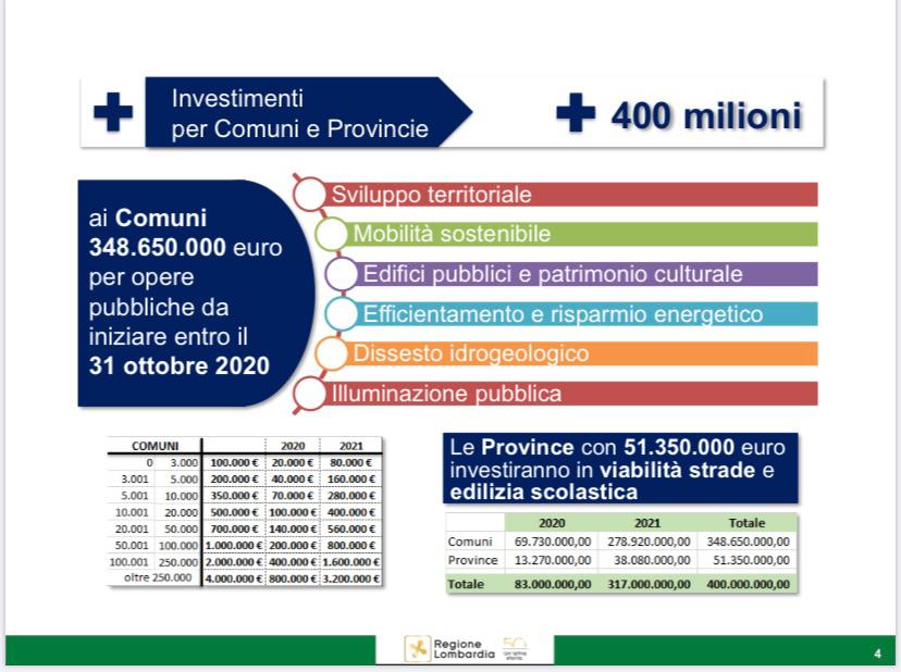 Regione Lombardia stanzia 3 miliardi per un Piano Straordinario di Investimenti per opere pubbliche di cui 400 milioni per Comuni e Province tra il 2020 e il 2021.