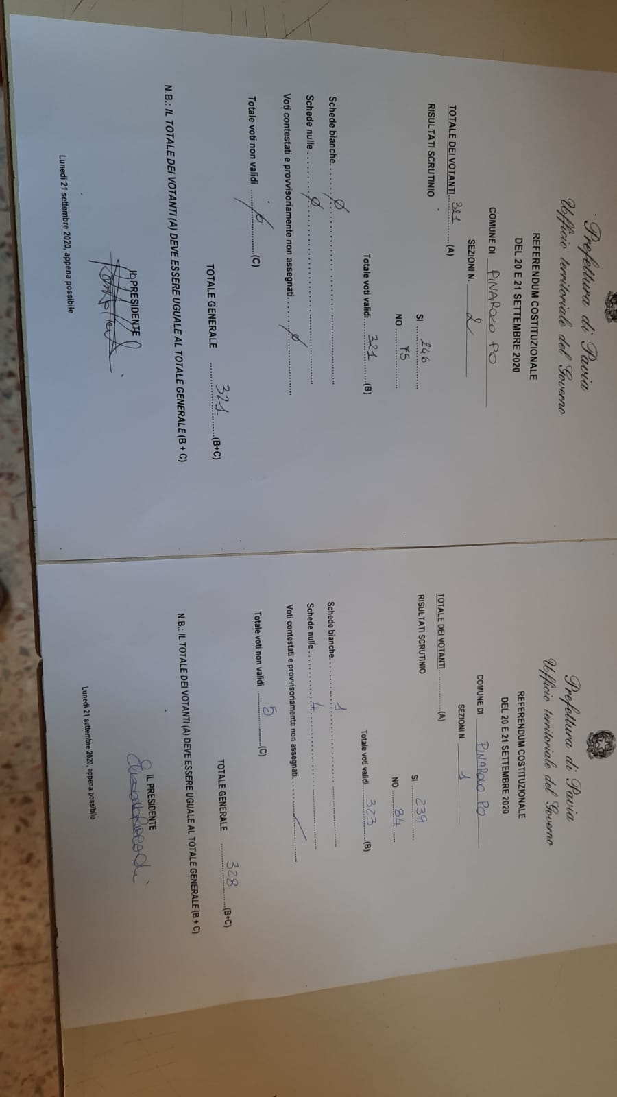 In allegato il risultato del Referendum Costituzionale nei due seggi di Pinarolo Po