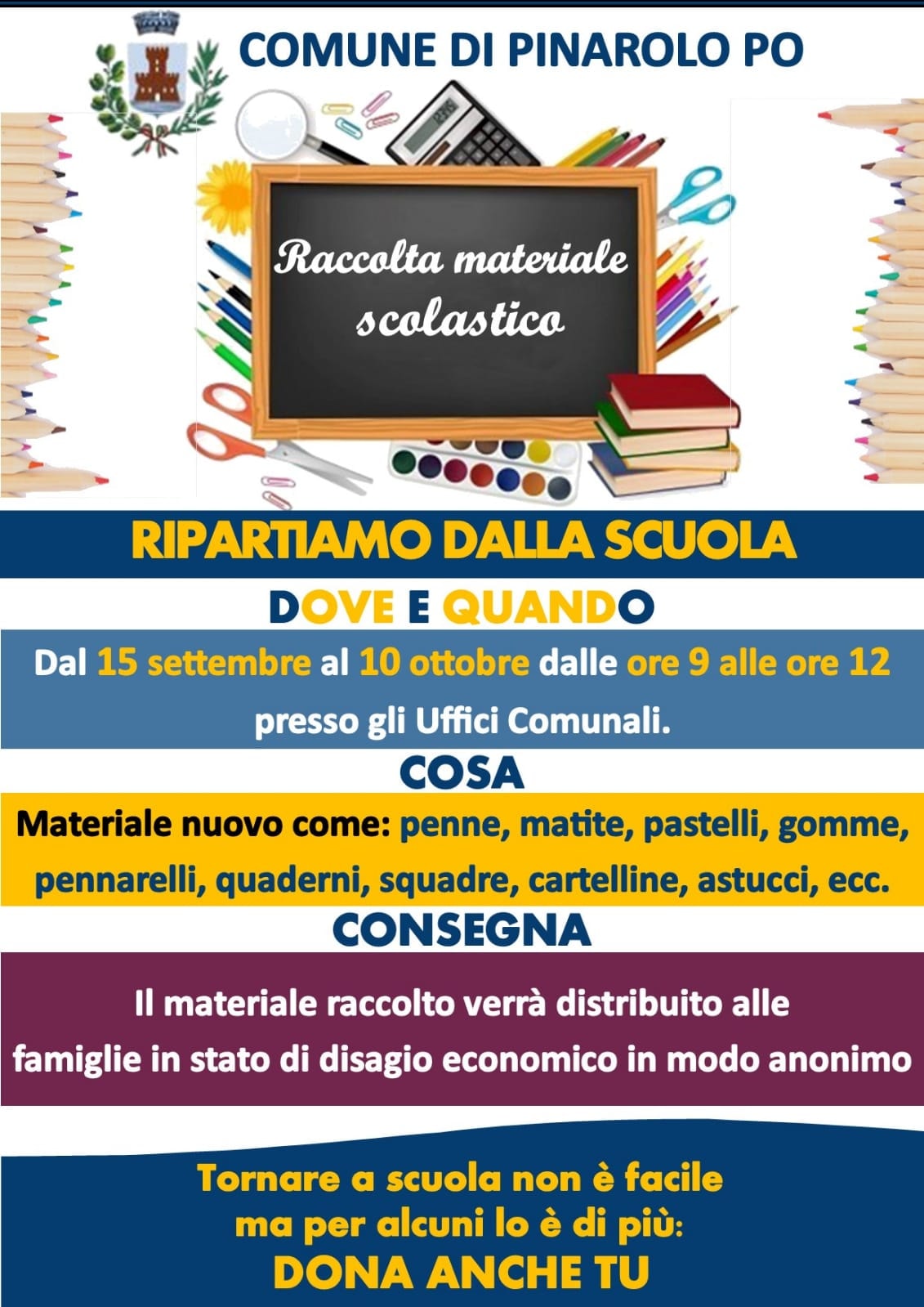 Il Comune di Pinarolo Po organizza, dal 15 settembre al 10 ottobre presso gli uffici comunali, la raccolta di materiale scolastico che verrà distribuito alle famiglie in stato di disagio economico.