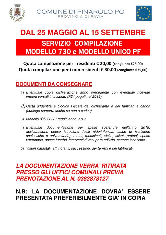 Dal 25 maggio al 15 settembre è possibile consegnare i documenti necessari alla compilazione del Mod.730/2020 presso gli Uffici Comunali esclusivamente previa prenotazione da effettuarsi telefonicamente al numero 0383 878127 negli orari di apertura.