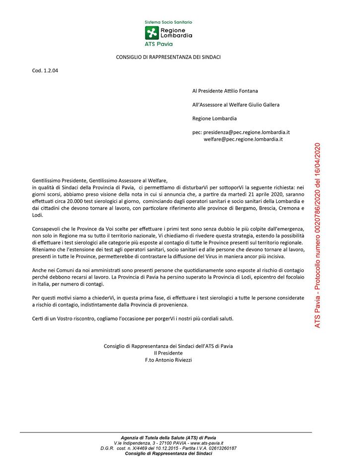 Pinarolo Po sottoscrive la richiesta presentata dal Presidente del Consiglio di Rappresentanza dei Sindaci di Ats Pavia al Presidente della Regione Lombardia e all'Assessore regionale al Welfare.