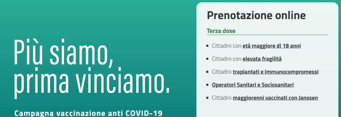 I cittadini over 18 (compresi i nati nel 2003) che hanno già completato il ciclo vaccinale primario possono prenotare l’appuntamento per la dose booster (3° dose) di vaccino anti Covid-19, come previsto dalle circolari del Ministero della Salute 0053886-25/11/2021-DGPRE-DGPRE-P “Estensione della platea vaccinale destinataria della dose “booster” (di richiamo) nell’ambito della campagna di vaccinazione anti SARS-CoV-2/COVID-19.