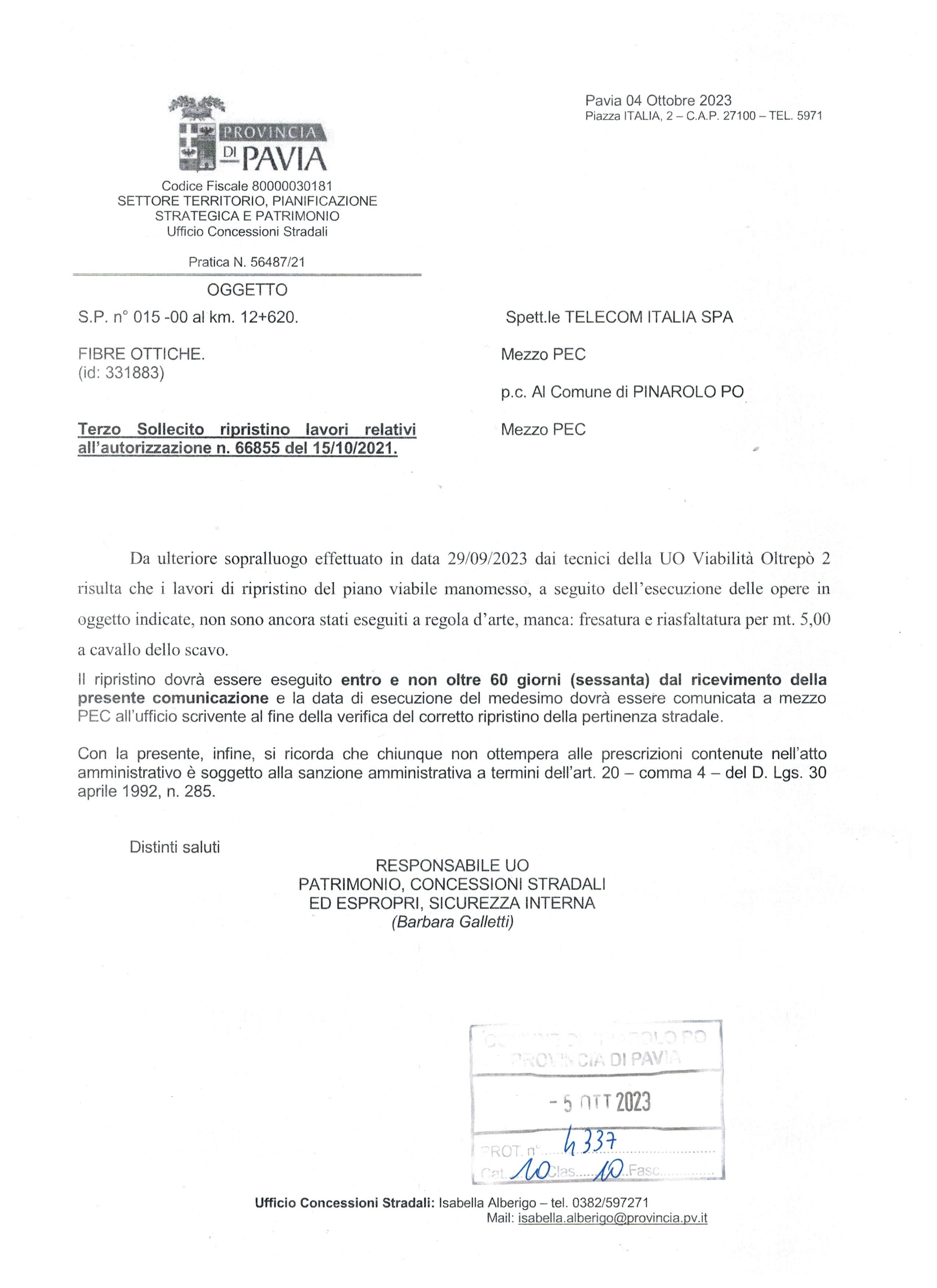 Comunicazione inviata dall'ente Provincia di Pavia - Settore Territorio, pianificazione strategia e patrimonio, Ufficio concessioni stradali , a Telecom Italia Spa e per conoscenza al nostro Ente per l'ennesimo (terzo) sollecito di ripristino lavori al piano viabile manomesso dovuti al posizionamento della fibra ottica.