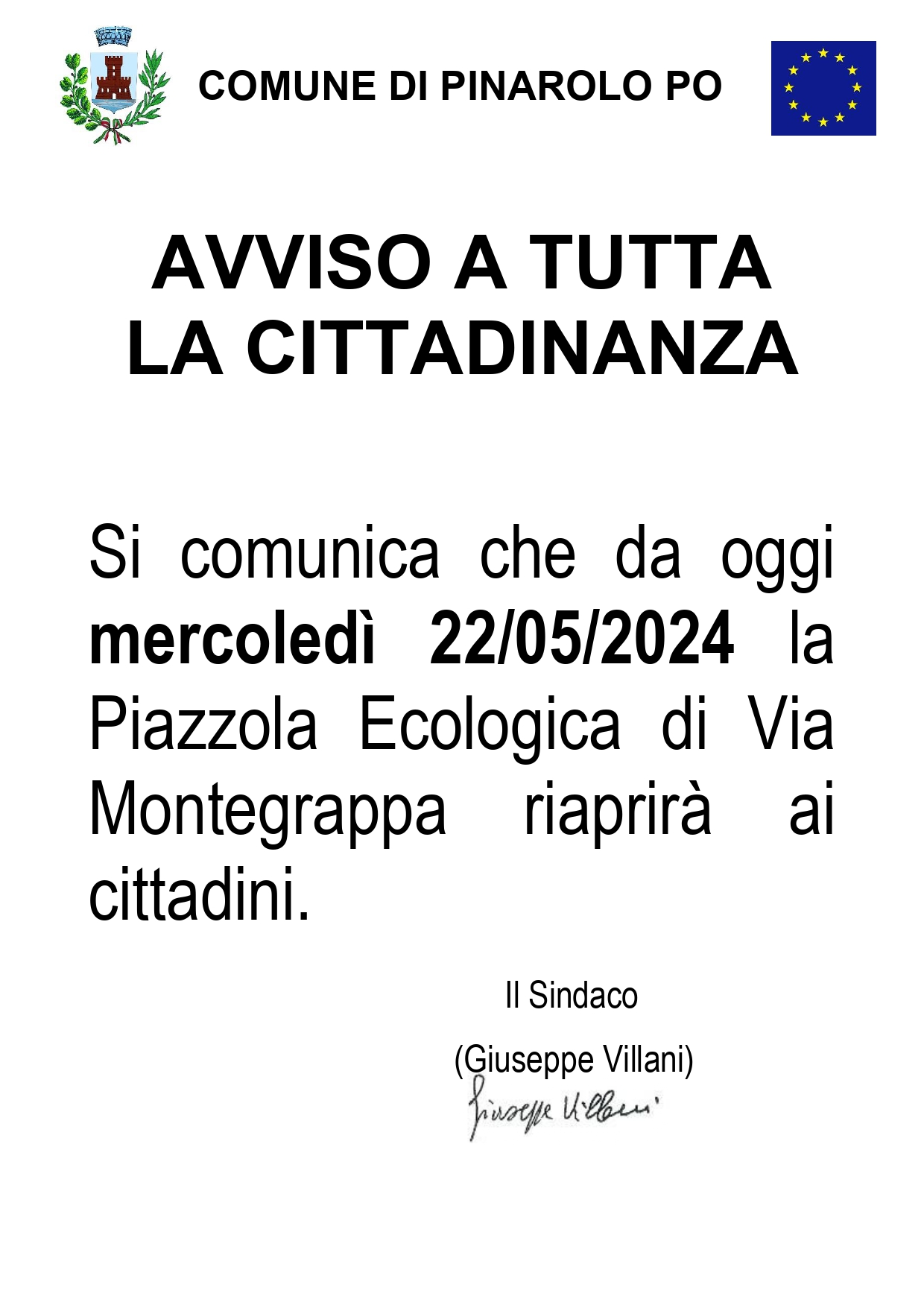Si comunica che da oggi, mercoledì 22 Maggio 2024, la Piazzola Ecologica verrà riaperta.