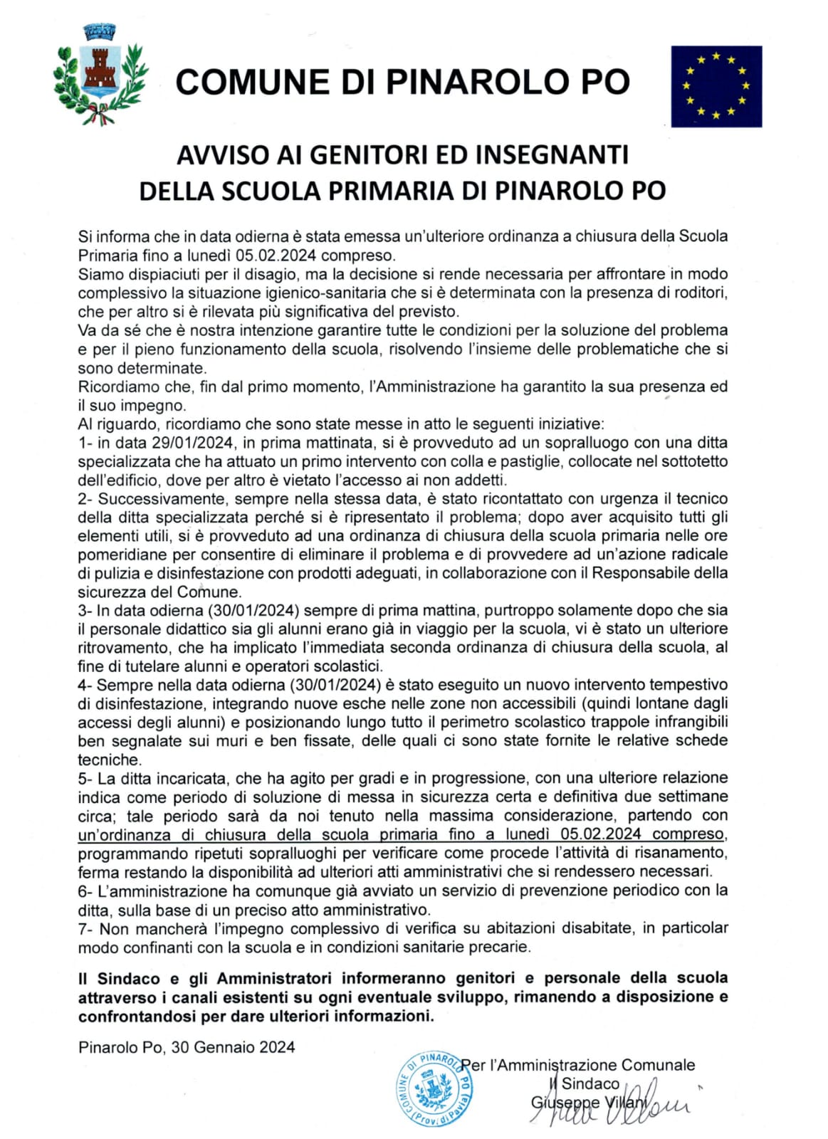 In allegato la Comunicazione del Sindaco relativa all'Ordinanza di chiusura della Scuola Primaria fino a lunedì 05.02.2024 compreso.