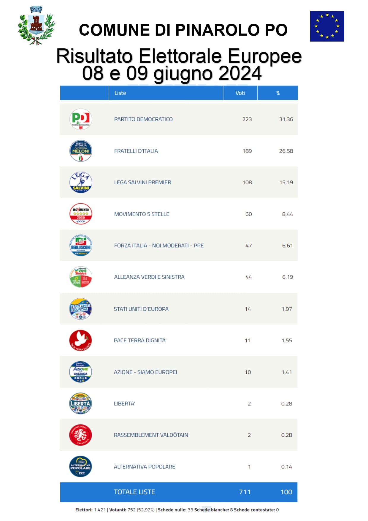 Risultati delle Elezioni Europee 08 e 09 giugno 2024 a Pinarolo Po