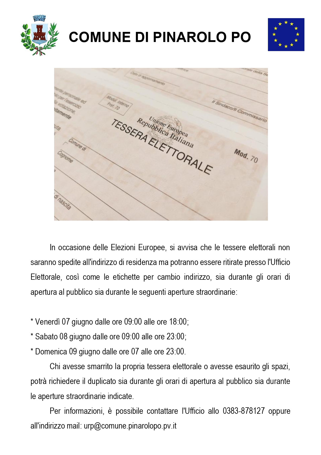 In occasione delle Elezioni Europee, si avvisa che le tessere elettorali non saranno spedite all'indirizzo di residenza ma potranno essere ritirate presso l'Ufficio Elettorale, così come le etichette per cambio indirizzo, sia durante gli orari di apertura al pubblico sia durante le seguenti aperture straordinarie: