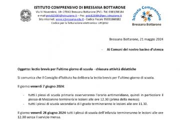 Si informano le SS.VV. che il consiglio d'istituto ha deliberato la lectio brevis per l'ultimo giorno di scuola.