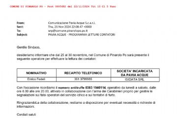 Dal 25 al 30 novembre un incaricato della ditta PAVIA ACQUE sarà presente sul nostro territorio per la lettura dei contatori.