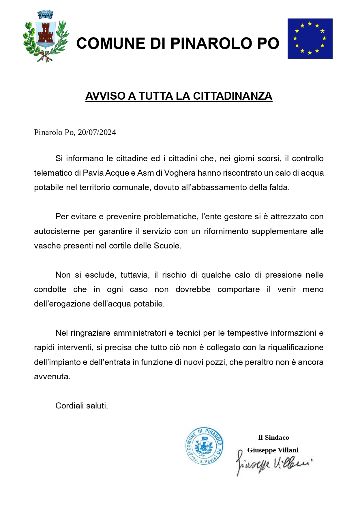 Si informano le cittadine ed i cittadini che, nei giorni scorsi, il controllo telematico di Pavia Acque e Asm di Voghera hanno riscontrato un calo di acqua potabile nel territorio comunale, dovuto all’abbassamento della falda.