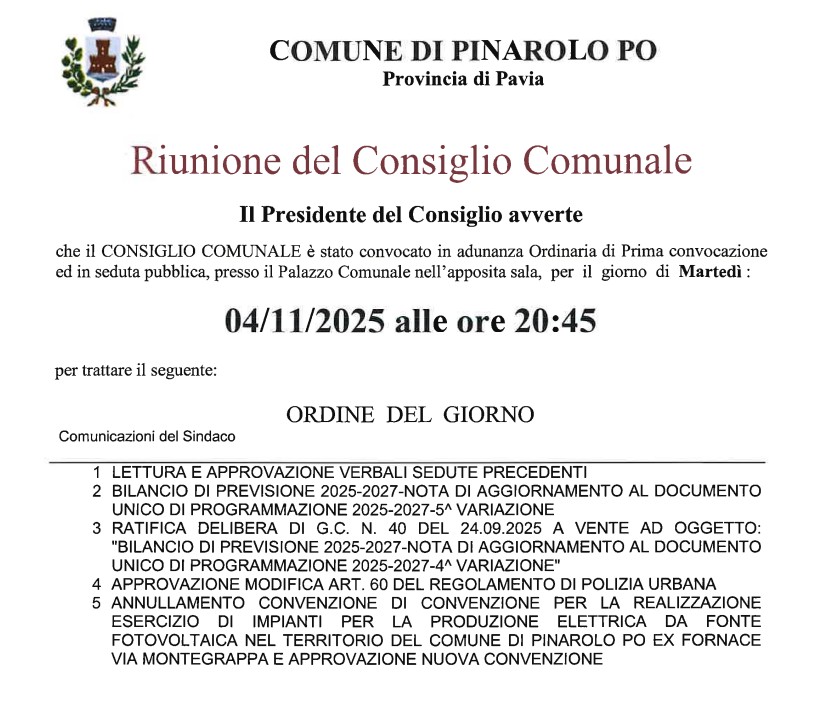 Convocazione Consiglio Comunale del 4.11.2025