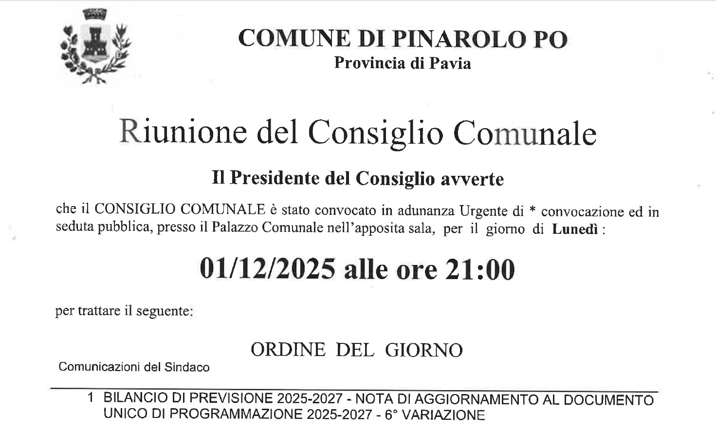 E' stato convocato per il giorno 01.12.2025 alle ore 21,00 il Consiglio Comunale come da odg allegato