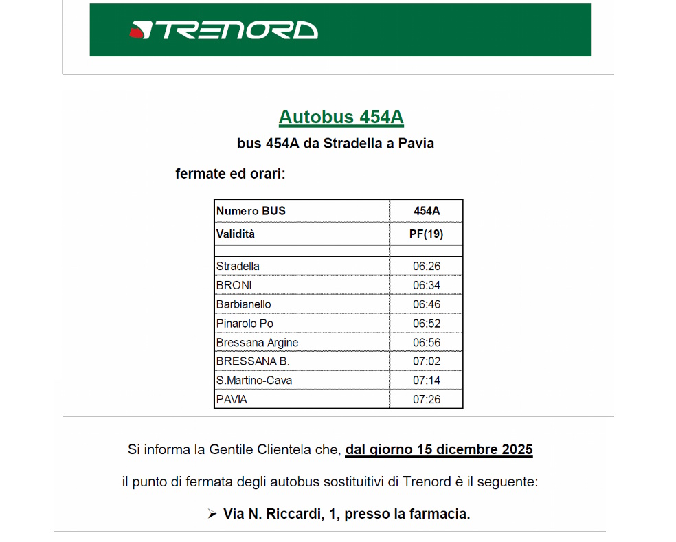 Trenord informa che dal 15 dicembre 2025 con l'entrata in esercizio del nuovo orario invernale viene istituita sulla linea Pavia-Stradella la nuova corsa del bus 454A da Stradella a Pavia.