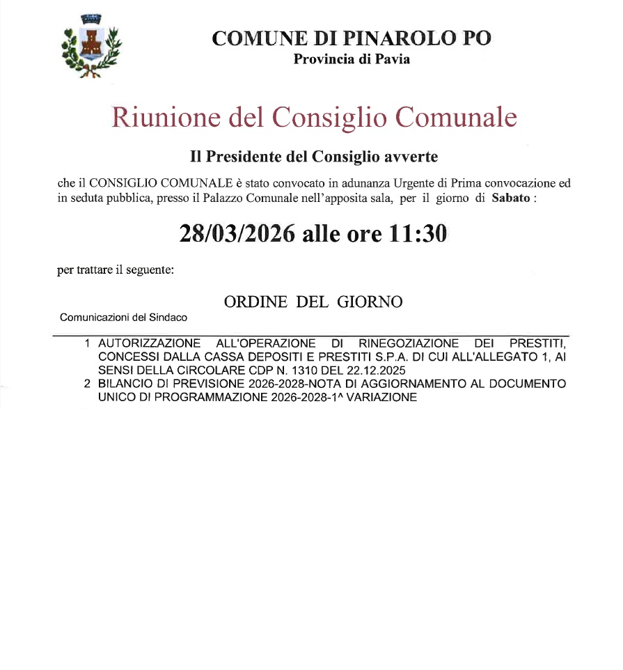 E' stato convocato Consiglio Comunale urgente per il giorno 28 marzo 2026 alle ore 11,30 come da odg allegato