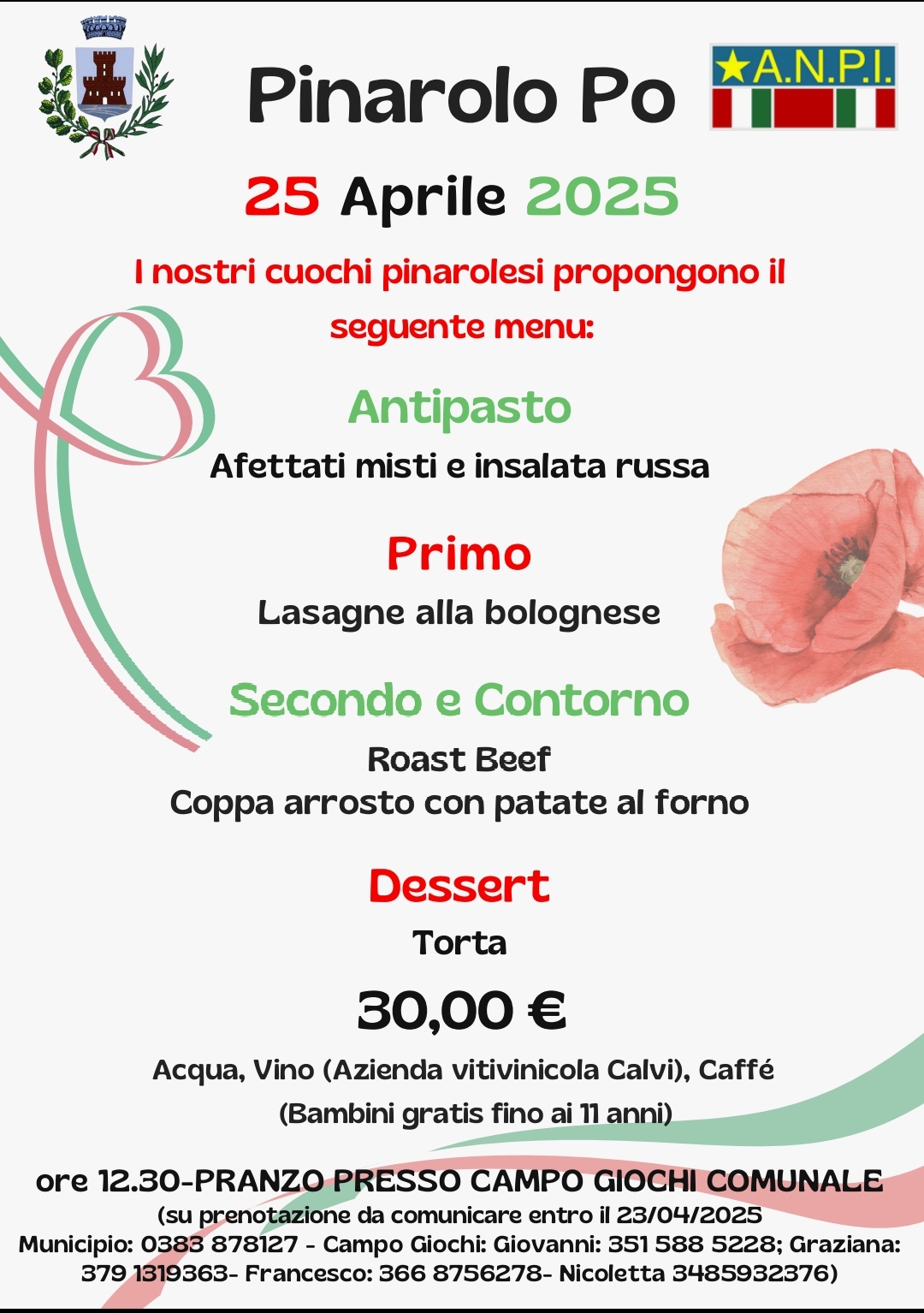 (su prenotazione da comunicare entro il 22/04/2025 ai n° Municipio: 0383 878127 - Campo Giochi Comunale Giovanni: 351 5885228 Graziana: 379 1319363 - Nicoletta: 348 5932376 - Francesco: 366 8756278)