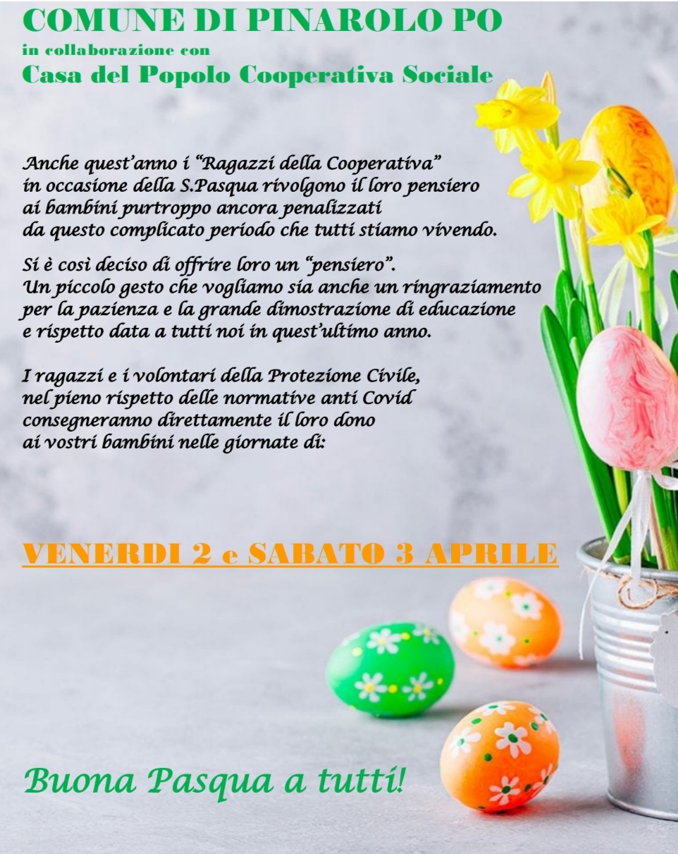 I "ragazzi della cooperativa" in occasione della S.S. Pasqua rivolgono il loro pensiero ai bambini di Pinarolo Po. Nelle giornate di venerdì 2 e sabato 3 aprile, insieme ai volontari della Protezione Civile, consegneranno a domicilio un Dono a tutti i bambini.