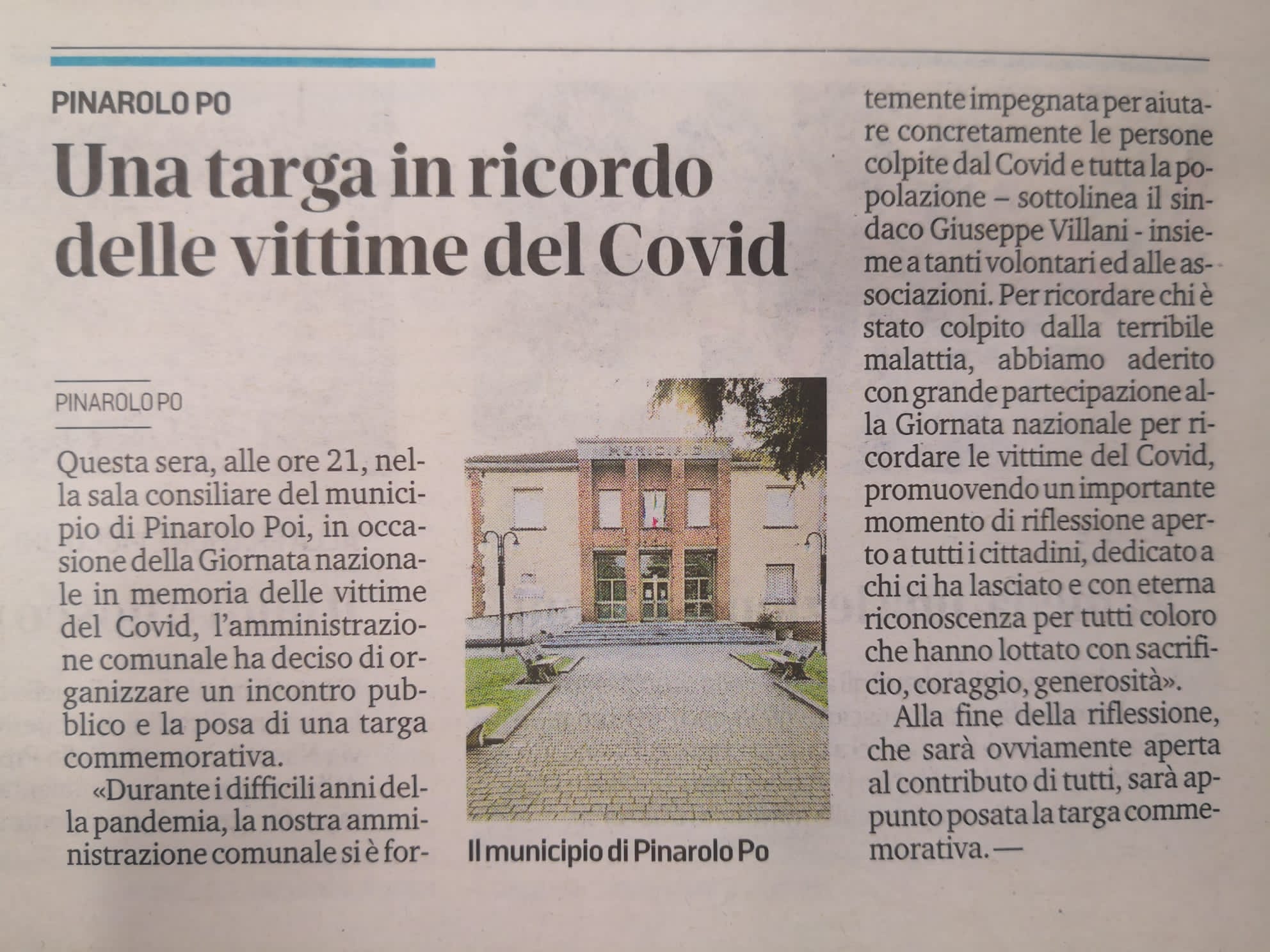 Il Comune di Pinarolo Po celebra la Giornata Nazionale in Memoria delle Vittime del COVID con un incontro pubblico Lunedì 18 Marzo presso la Sala Consigliare del Comune alle ore 20,45.