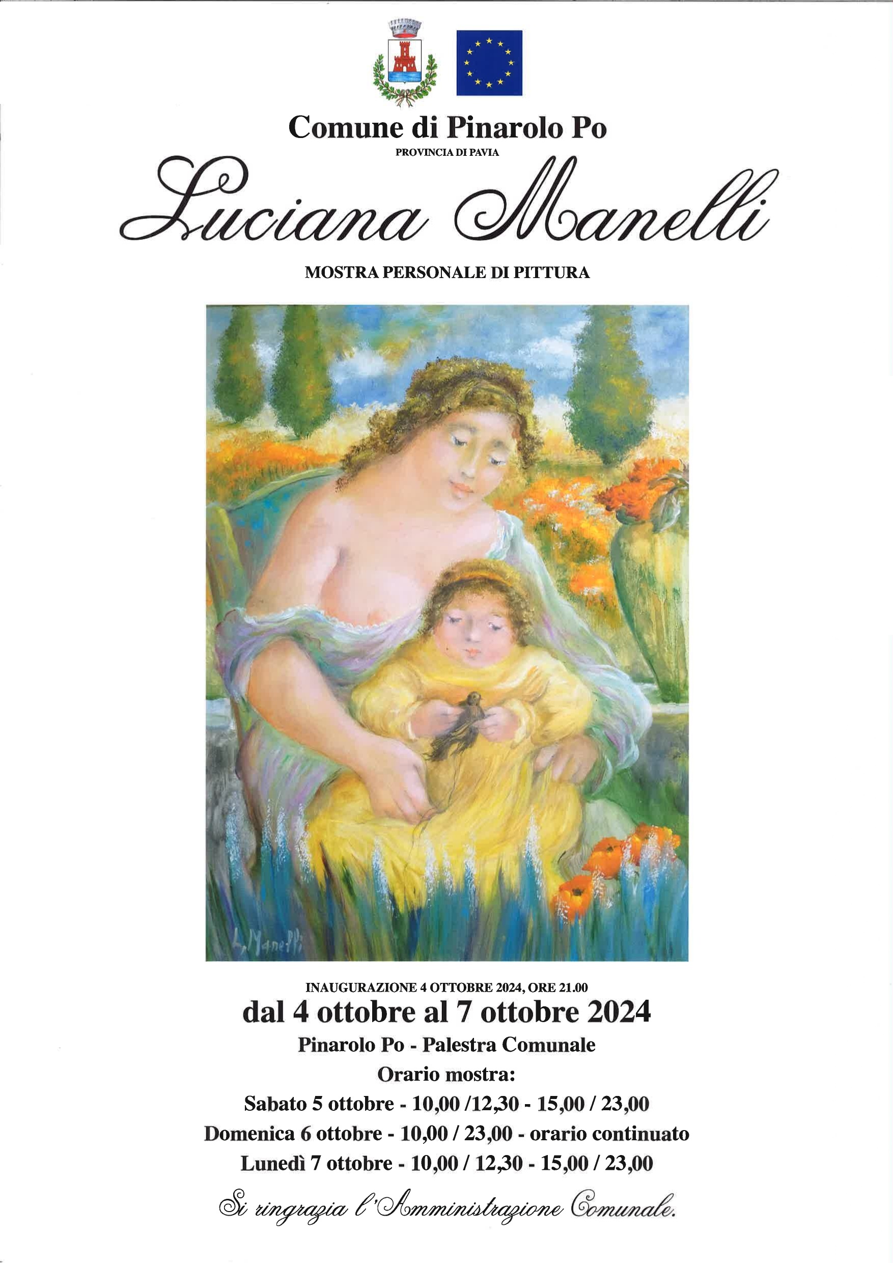 Dal 4 ottobre al 7 ottobre 2023 presso la palestra comunale di Pinarolo Po si terrà la mostra personale di Luciana Manelli.