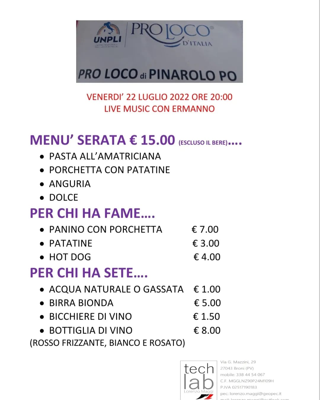 L a PRO LOCO di Pinarolo Po organizza venerdì 22 luglio al Campo Giochi Comunale alle ore 20,00 una Cena-Concerto.